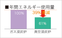 アセチレンガスを適時適量供給できることや、週末など短期間の休日にこまめに稼働を休止できること、さらに炉外への放散熱が少ないことなど、真空浸炭炉はエネルギー効率に優れるため、年間で39%の省エネルギー効果を確認。さらに温度のばらつきが少なく、ガス浸炭炉に比べ品質同等で約2倍の大量処理も可能となった。