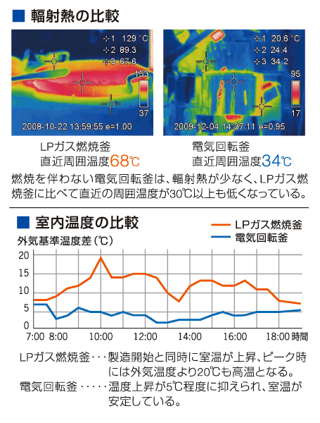LPガス燃焼釜は製造開始と同時に釜からの放熱により室温が上昇、夏場は50℃になることもあった。電気回転釜は温度上昇が5℃程度に抑えられ室温が安定、快適な作業環境が実現した。